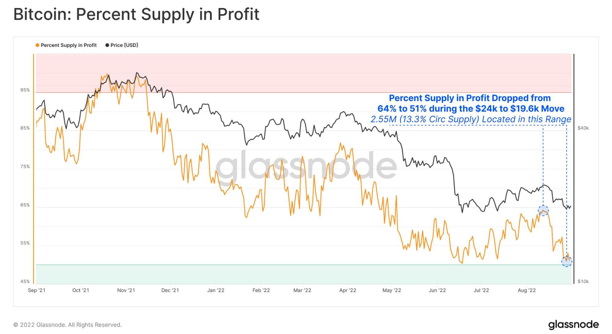 因此,我們可以觀察到13.3%的流通供應在從2.4萬美元跌至1.96萬美元的過程中不再盈利。這表明255萬(13.3%)的流通供應在此價格范圍內進行了最后的交易。