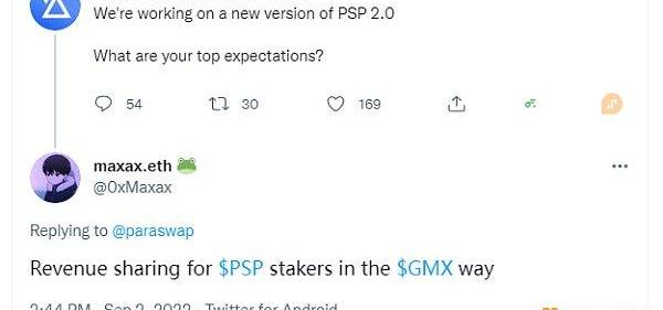 經過流動性挖礦的教育和熊市的洗禮,投資者在逐步更看重真實收益。比如,在聚合交易所ParaSwap9月2日社交媒體下,社區用戶在直接要求ParaSwap像GMX一樣向PSP質押者分享收入。