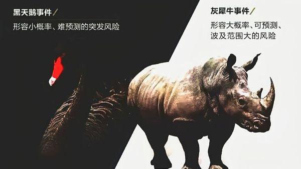 而灰犀牛事件則更為形象,作為陸地上僅次于大象的兇猛動物,灰犀牛平時看起來安靜,人們雖然知道存在危險,但仍然可能會在視線范圍內觀看甚至可以慢慢地靠近它,但灰犀牛一旦暴怒沖向你時,往往就措手不及了,灰犀牛事件也就得以代指早有預期的潛在巨大危險突然爆發。?