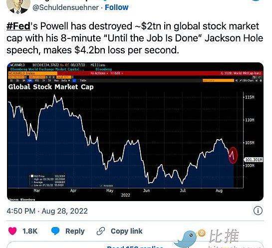 根據一項統計,鮑威爾8分鐘的講話從全球股市中蒸發了超過2萬億美元,其中僅美國股市就蒸發了1.25萬億美元。