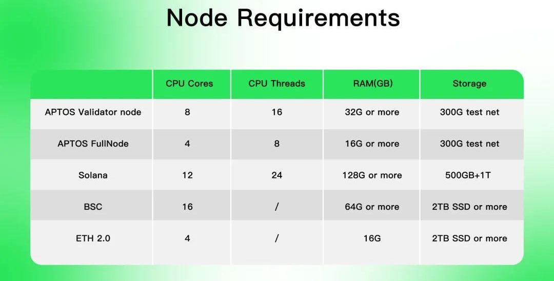 Aptos的并行化的架構采用CPU進行事務處理,Solana在執行層面的并行化架構采用CPU+GPU作為運算單元,Solana對于節點的硬件要求明顯高于Aptos不少。