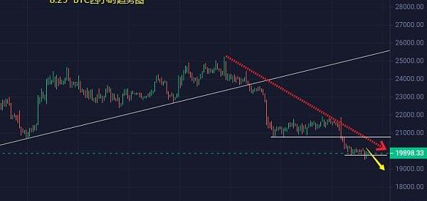 隔日震蕩調整20000關口附近后早間一波急跌直接下破此關口最低下探19520,在上周對于比特幣趨勢的分析當中我們一直強調20700支撐的重要性,此位置的失守對于多頭而言必然是致命的;而從日線級別來看破位此位置后下方預計將回踩測試19000關口附近,此位置是年內的三底支撐,一旦空頭持續發力強勢跌破19000關口,那么迎接比特幣的必然是年內新低,短期內乃至九月份上旬,預計走勢上依然會呈現空頭弱勢下行的局勢,但是這種空頭不會一直延續下去,預計在九月下旬后價格會慢慢復蘇,而個人預測下半年會迎來一輪牛市,敬請期待!