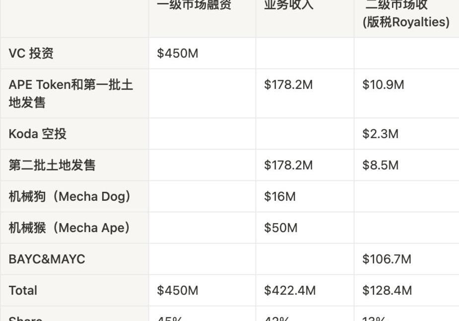 事實上,YugaLabs從原項目BAYC一級市場mint只拿到了$2.2M,還不到2022年收入的千分之四。靠持續的BUIDL,才有了不斷發新項目做業務收入的底氣,同時也從VC融資了4.5億美元。
