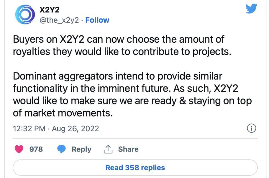 官方說法是「主流的聚合器打算在不久的將來提供類似的功能。為確保X2Y2能做好準備并掌握市場動向我們做出了以上更新」