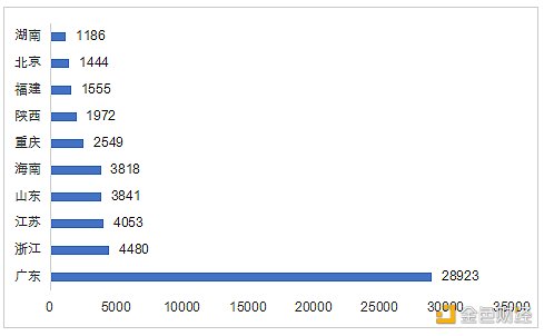 如圖1-3所示,截止到2020年年底,廣東省企業數量最多,達到2.8萬余家,占比超過40%,遠超其它地區,主要分布在廣州和深圳等地。其次是浙江和江蘇,分別為4480家和4053家。