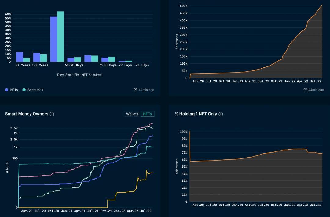 另一個統計數據是給定NFT項目中“智能資金”的流動。智能貨幣,由標記為高凈值、高容量或已知機構實體的錢包定義,于2021年10月開始鑄造ENS地址。自2021年底以來,智能貨幣量一直在飆升,其中早期NFT采用者擁有最多地址。