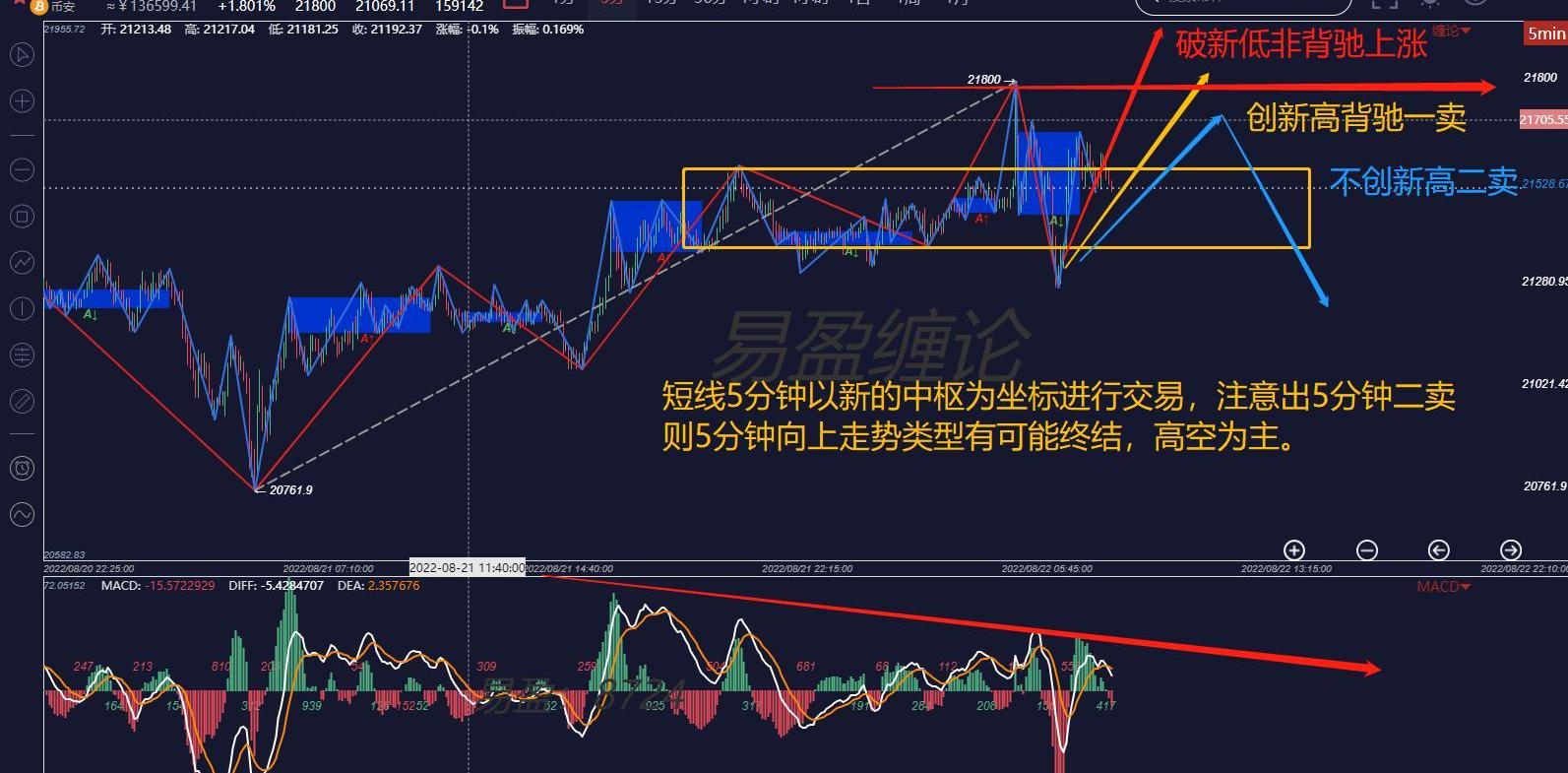 短線5分鐘新的中樞可以畫出來,當下以中樞震蕩戰法應對,中樞上方次級別背馳賣,高空為主。如果出現5分鐘二賣則需要考慮5分鐘向上走勢類型終結走反向走勢類型。日內最好的機會是5分鐘二賣做空,止損放在一賣高點,以小博大。同時注意三類買賣點的產生,順勢而為!