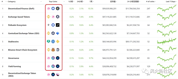 它按照熱點板塊來劃分幣種,比如defi、平臺幣、NFT這樣的,還有按不同的生態,比如波卡生態、BSC生態來分組,并顯示每個板塊中目前的龍頭,以及每個板塊整體的漲跌幅,以供大家選擇參考。