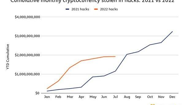 截止到2022年7月,價值19億美元的加密貨幣被黑客盜取,而2021年同一時間只有不到12億美元。被盜金額的數量還處于增長趨勢當中,8月第一周Nomad跨鏈前被盜1.9億美元和多個Solana錢包共計500多萬美元被盜。