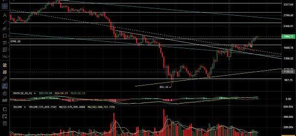 以太坊昨日破位前高至2020后承壓回落,整體呈高位震蕩,波動較小僅25余點空間,周末盤面沒啥動靜,目前幣價在1985附近運行,四小時級別行情沿ma7上行,macd多頭逐步縮量轉陰雙線粘合,但回調力度較小未曾跌破ma7,行情仍是多頭結構,周末橫盤整理波動較小,穩健可以觀望,周k來看行情收大陽的概率較大,macd多頭逐步放量雙線粘合,kdj三線金叉向上延伸,下周有延續多頭走勢的需求大概會去ma30附近,思路上建議低多為主,上方壓力2000-2020,下方支撐1960-1920