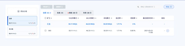 礦機運行一段時間后,就可以從魚池的控制面板中看到算力和預計收益了。