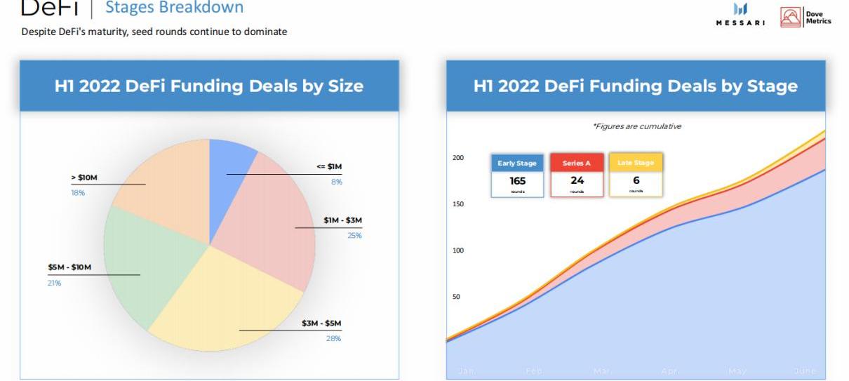 加密研究機構Messari近日發布了與DoveMetrics團隊聯合推出的2022年上半年加密融資報告。這份報告統計了上半年在Web3、DeFi、CeFi、基礎設施和NFT的總計1199起投融資事件,以及包括機構基金、DAO、天使投資人等在內的4300多個活躍的加密投資方。