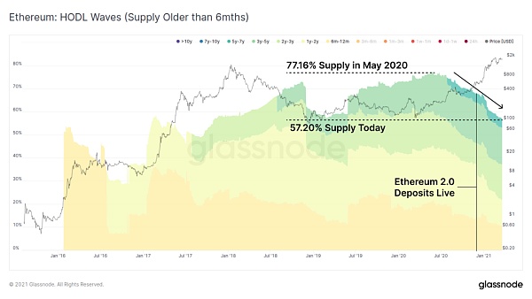 我們也看到更多的以太坊處在休眠狀態。這張圖顯示,自2020年5月以來,超過6個月的以太坊供應量一直在穩步下降。有可能在一些獲利的同時,一些供應量可能被部署到DeFi智能合約甚至以太坊 2.0合約中(注意從2020年底開始大幅下降)